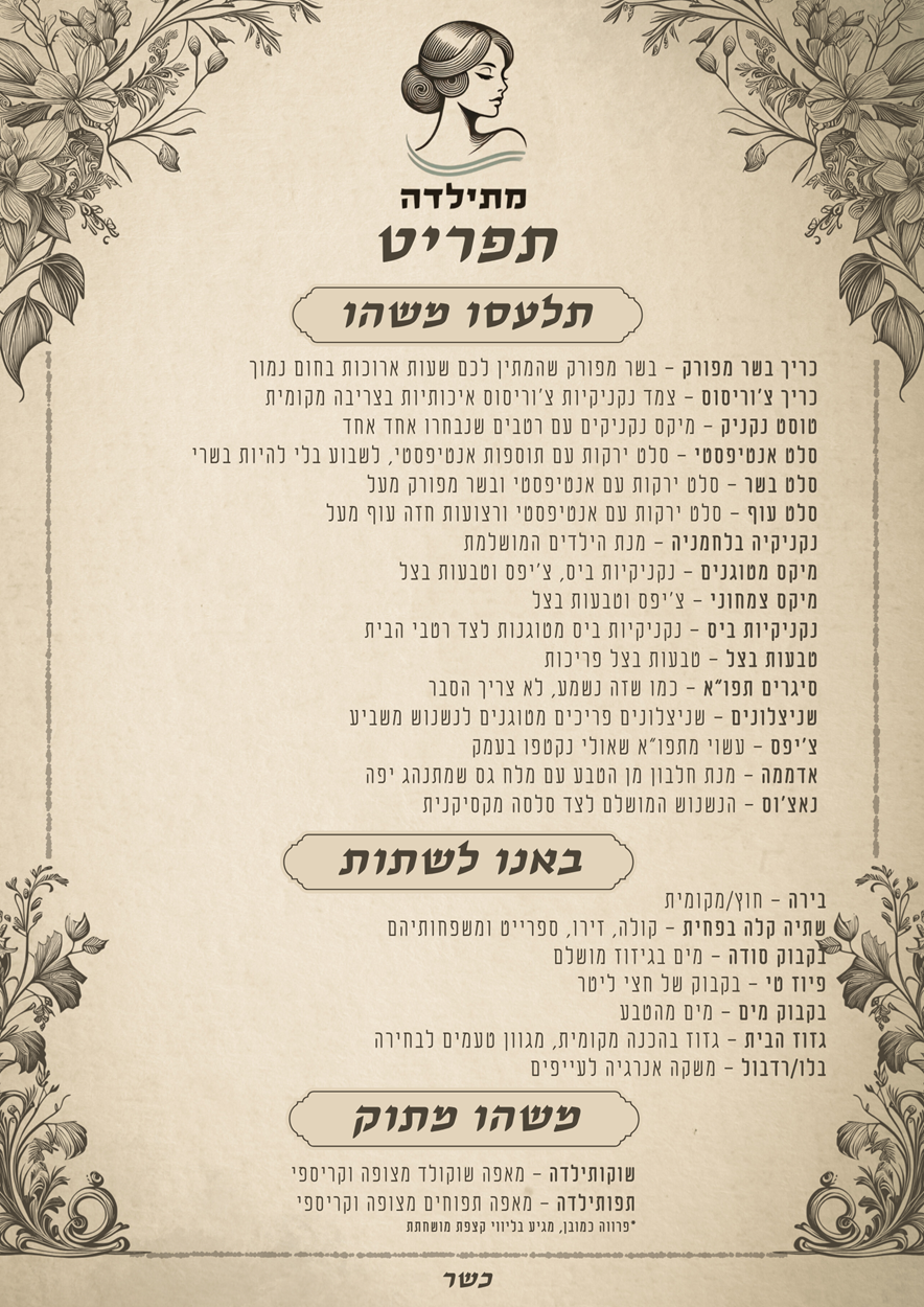 ברוכים הבאים למתילדה, פודטראק בשרי וכשר בכניסה לקיבוץ עין הנצי"ב בעמק המעיינות, עם תפריט מגוון ואוכל משובח, מוזיקה מעולה ואוירה קסומה, מחכים לכם באהבה. המקום כשר. שעות פעילות: שלישי עד חמישי 19:00-23:00 ובשעון חורף פותחים גם במוצ"ש 20:00-23:00 (תמיד מומלץ להתעדכן ברשתות החברתיות על שינויים בשעות הפעילות) מה עוד חשוב לדעת: